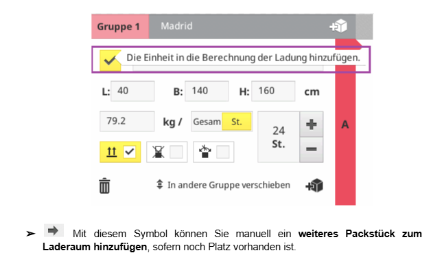 Wenn Sie die Maus neben den grünen Punkt bewegen, erhalten Sie die Option (+ Symbol), zusätzliche Packstücke dieses Typs hinzuzufügen – zusätzlich zur ursprünglich eingegebenen Menge: