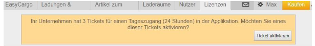 Loggt sich ein Nutzer ohne zugewiesene Lizenz ins System ein und ist noch eine aktive Lizenz verfügbar, ordnet das System dem Nutzer automatisch eine der verfügbaren Lizenzen zu. Wenn Sie keine Lizenz aktiviert haben, aber über ein freies Ticket verfügen, wird der Nutzer gefragt, ob er ein Tagesticket aktivieren möchte.